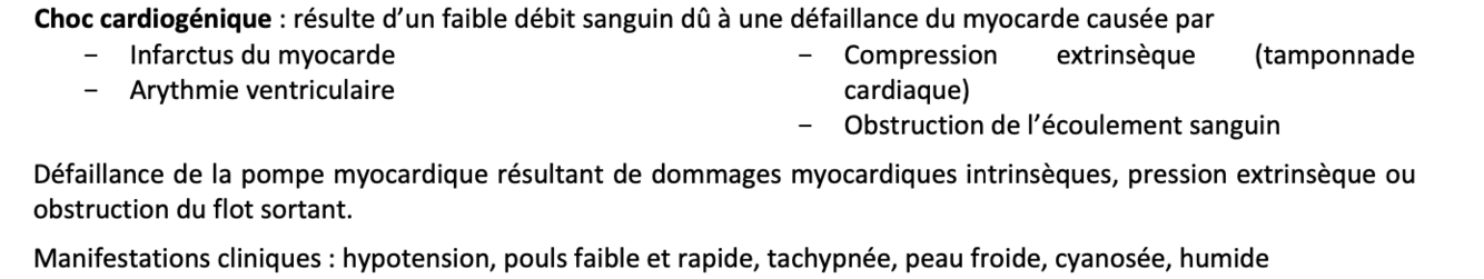 Choc : Caractérisée par une hypotension systémique due à un débit cardiaque réduit ou à un volume sanguin réduit