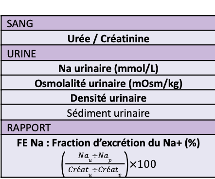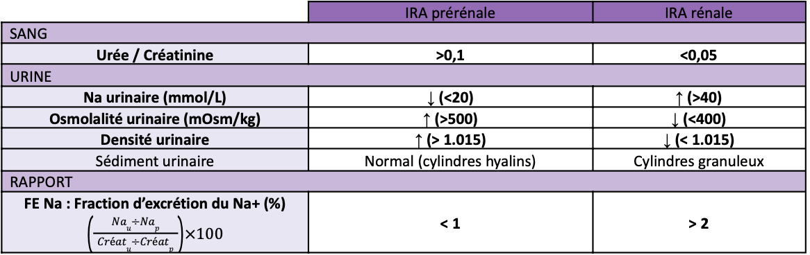 Compare IRA prérénale et IRA rénale par rapport à ces différentes valeurs