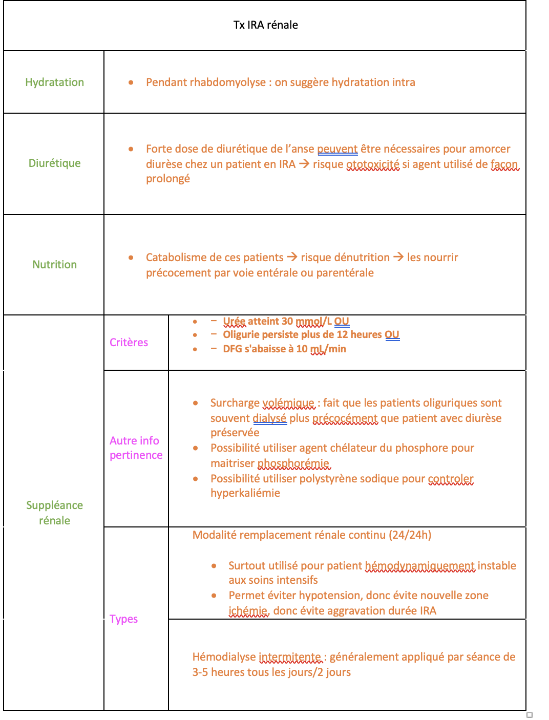 Par rapport aux différents tx de IRA rénale, explique les critères pour la Suppléance rénale?