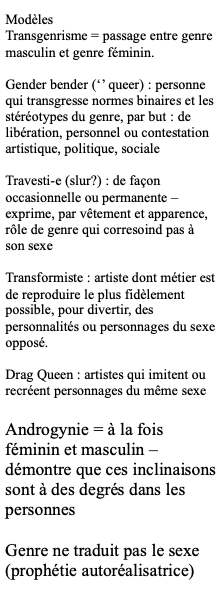 Genre (idéal) = (d’ordre socioculturel) – rôle/modèle qui refère à tout ce qui est considéré comme féminin ou masculin dans une société donnée + à un moment de l’histoire (nécessite contexte)