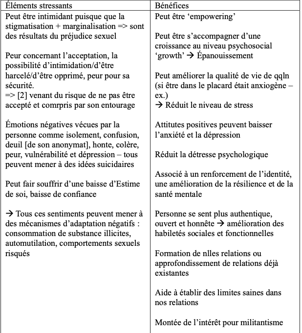 Éléments stressants / Bénéfices qui ressortent du coming out
