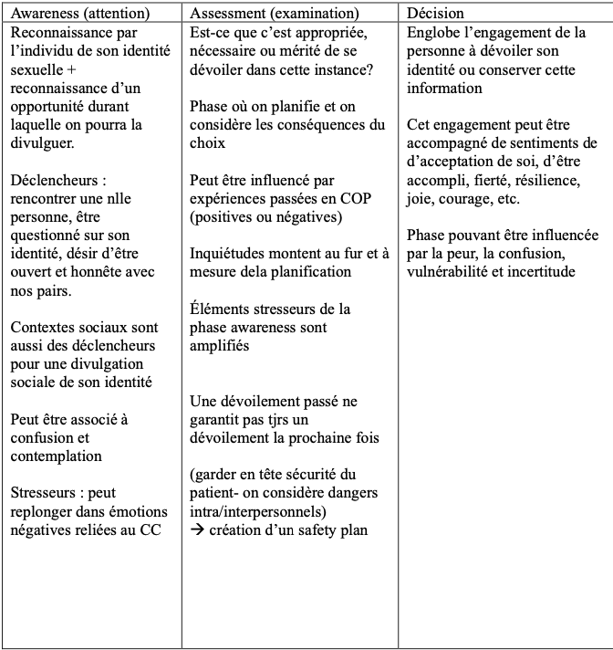 Processus décisionnel durant lequel des situations sociales activent l’attention d’une personne à l’opportunité de divulguer son identité, ainsi que le processus d’examination et de divulgation potentielle