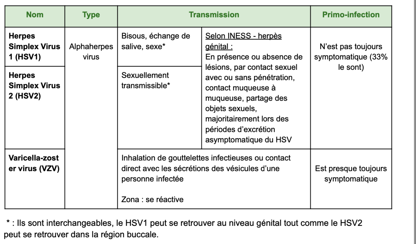 Décrire la transmission de HSV-1, HSV-2 et VZV et indiquez s’il y a présence de symptômes lors de la primo-infection