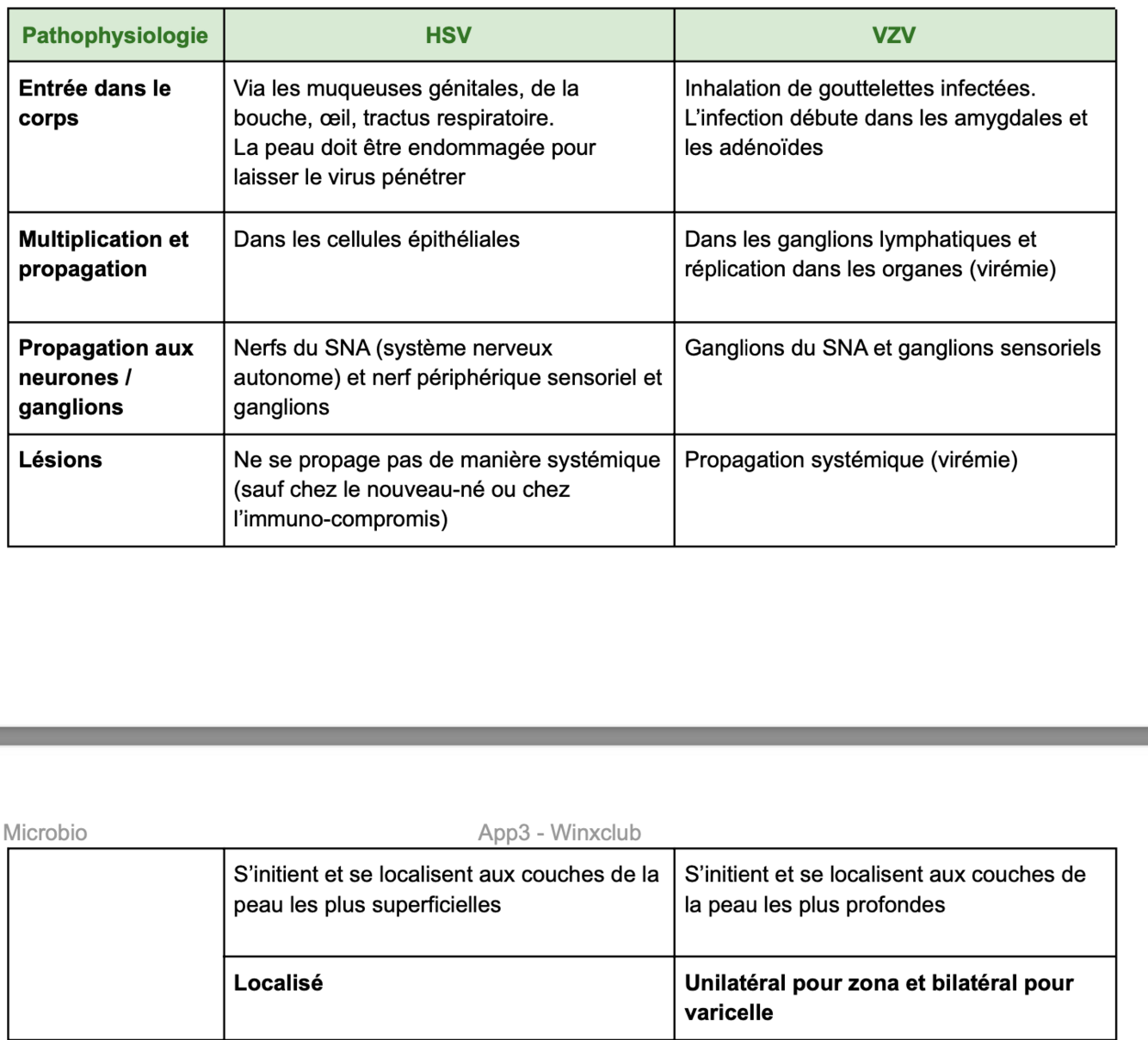 Décrire l’entrée dans le corps, la multiplication + propagation et les lésions systémique ou pas de HSV et VZV