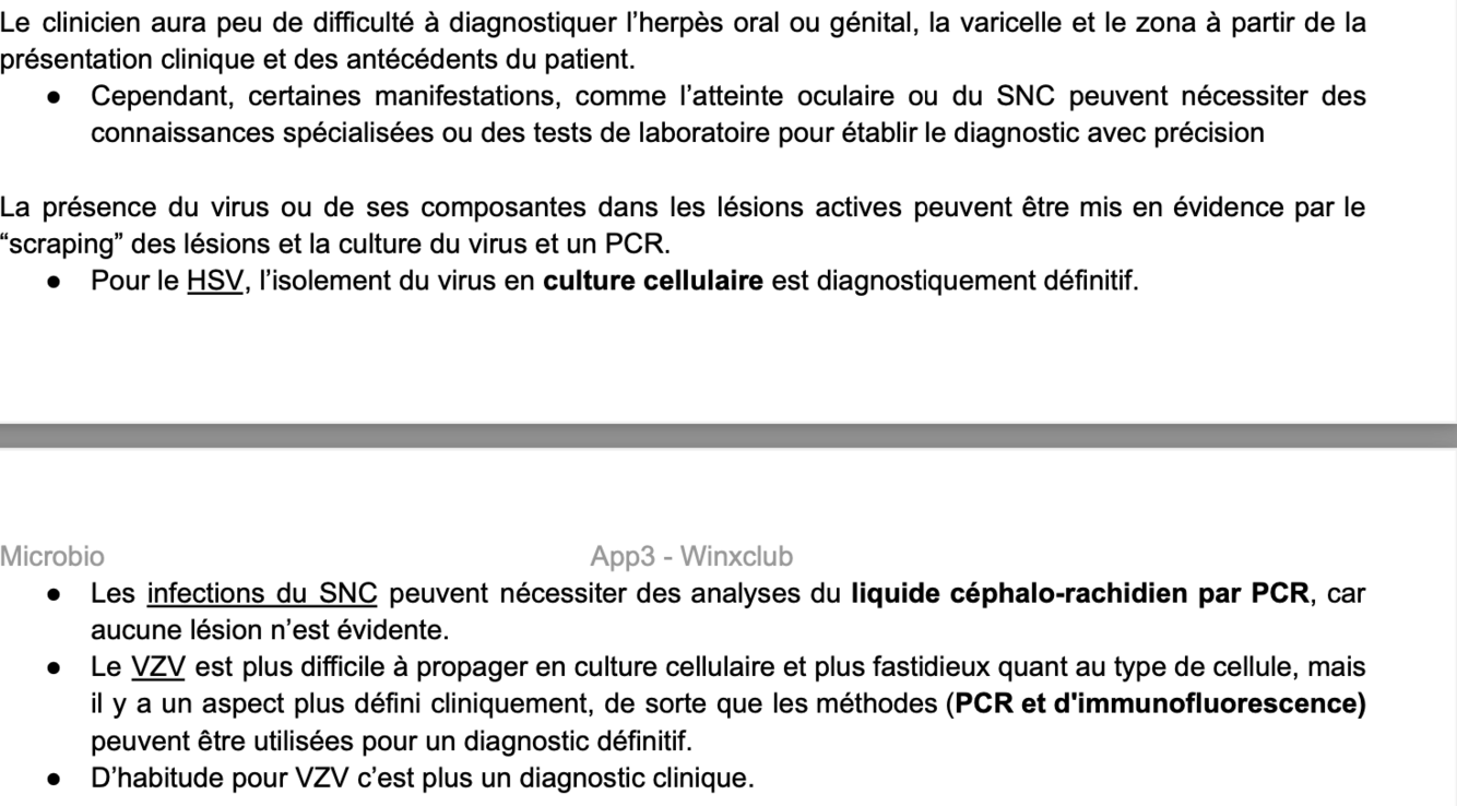 Quelles sont les méthodes de prélèvement et les méthodes diagnostiques requises lorsqu’une infection VZV ou HSV est suspectée?