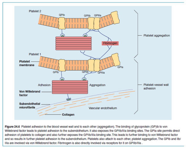 * GPIIb-IIIa : Adhésion au facteur von Willebrand et son site de liaison est aussi le récepteur du fibrinogène (adhésion des plaquettes à l’endothélium et pour leur agrégation)
