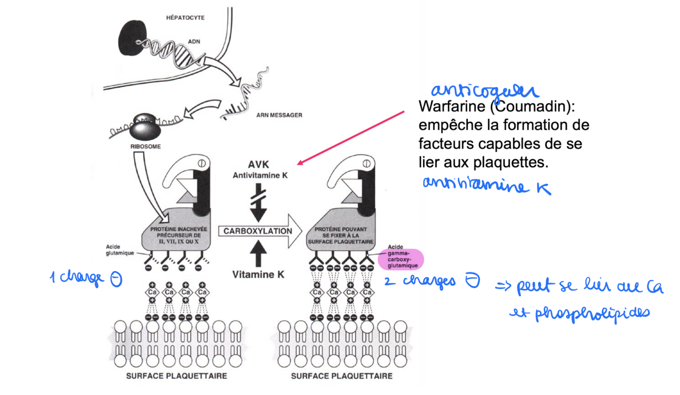 L’acide glumatique au bout de la chaine d’acide aminée de certains facteurs de coagulation (II, VII, IX, X) a seulement une charge négative. C’est sous l’action d’une carboxylase qui dépend de la vitamine K que les acides glutamiques de la chaine du facteur VII vont être gamma-carboxyler et cela va leur permettre d’avoir deux charges négatives ce qui va leur permettre aux facteurs de se lier aux plaquettes.