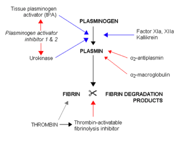 La fibrinolyse se fait surtout par la plasmine, qui peut défaire la fibrine, le fibrinogène, le facteur V et VIII et plusieurs autres protéines.