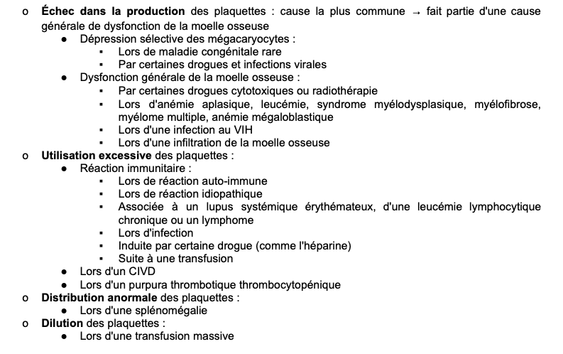 1. Échec dans la production des plaquettes : cause la plus commune → fait partie d’une cause générale de dysfonction de la moelle osseuse: