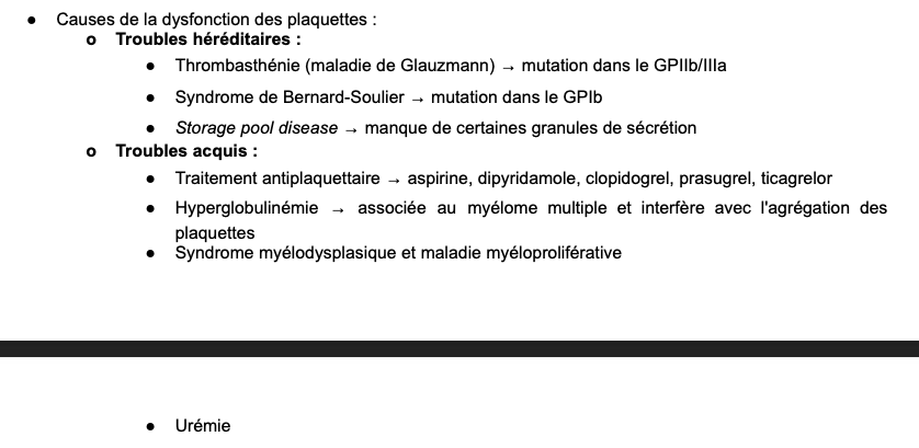Défaut dans la fonction des plaquettes –> Hémostase primaire