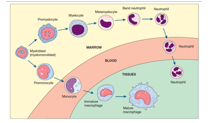 Les granulocytes et les monocytes sont formés dans la moelle osseuse à par r d’une cellule précurseur commune (myeloblaste (myelomonoblaste) = Granulocyte monocyte progenitor : CFUGM (colony forming unit)).