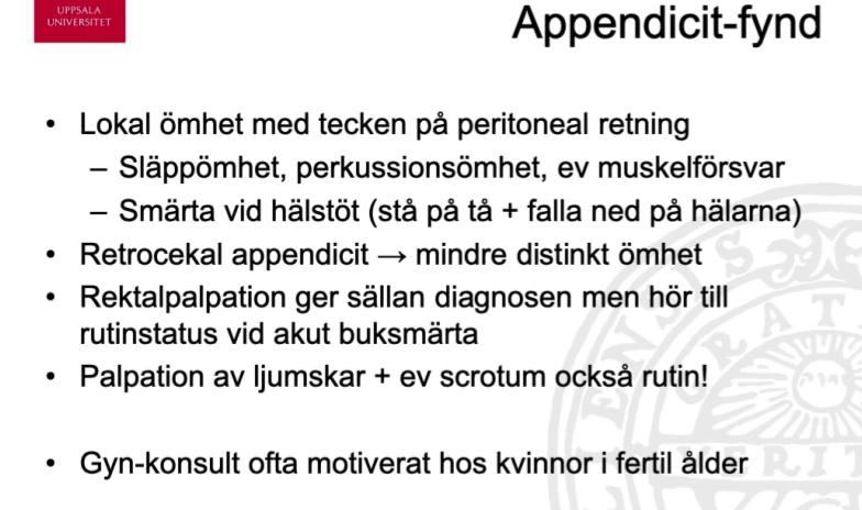 - mindre distinkt ömhet, men andra fynd som t.ex. hälstöt är lika som för en “vanlig appendicit”.