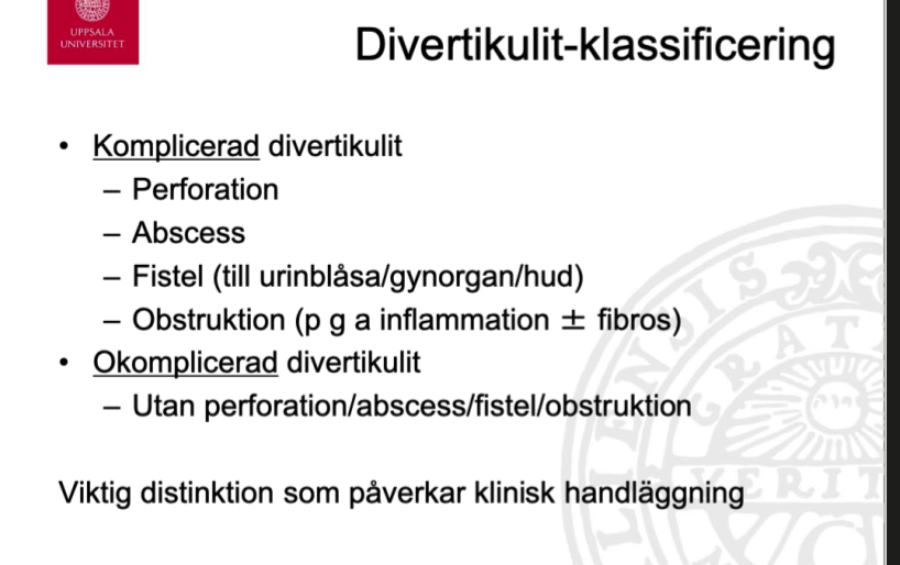 Man delar in divertikulit i komplicerad och icke komplicerad. Detta har betydelse för kliniska handläggningen.