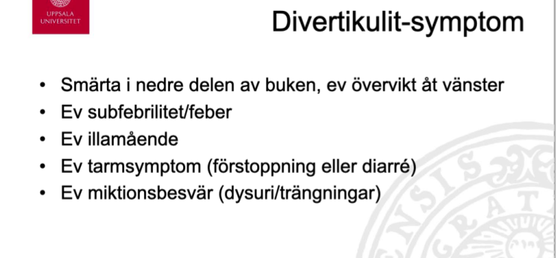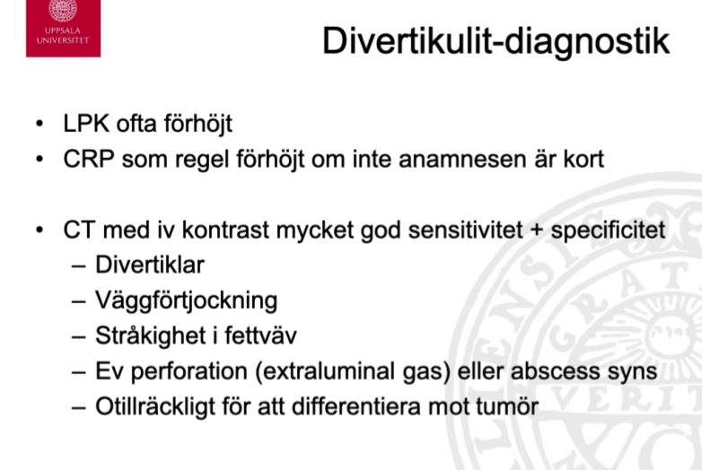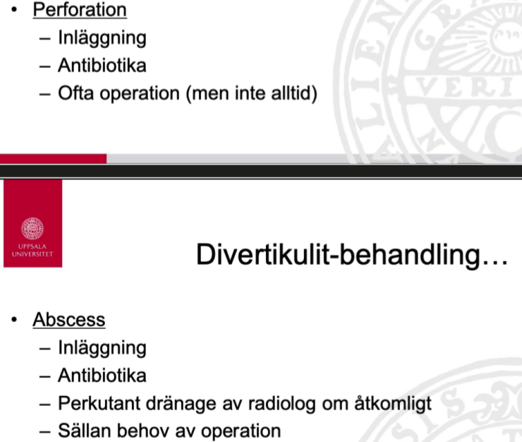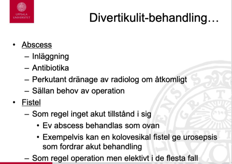 Vid en komplicerad divertikulit (abscess eller perforation) lägger man in patienten.