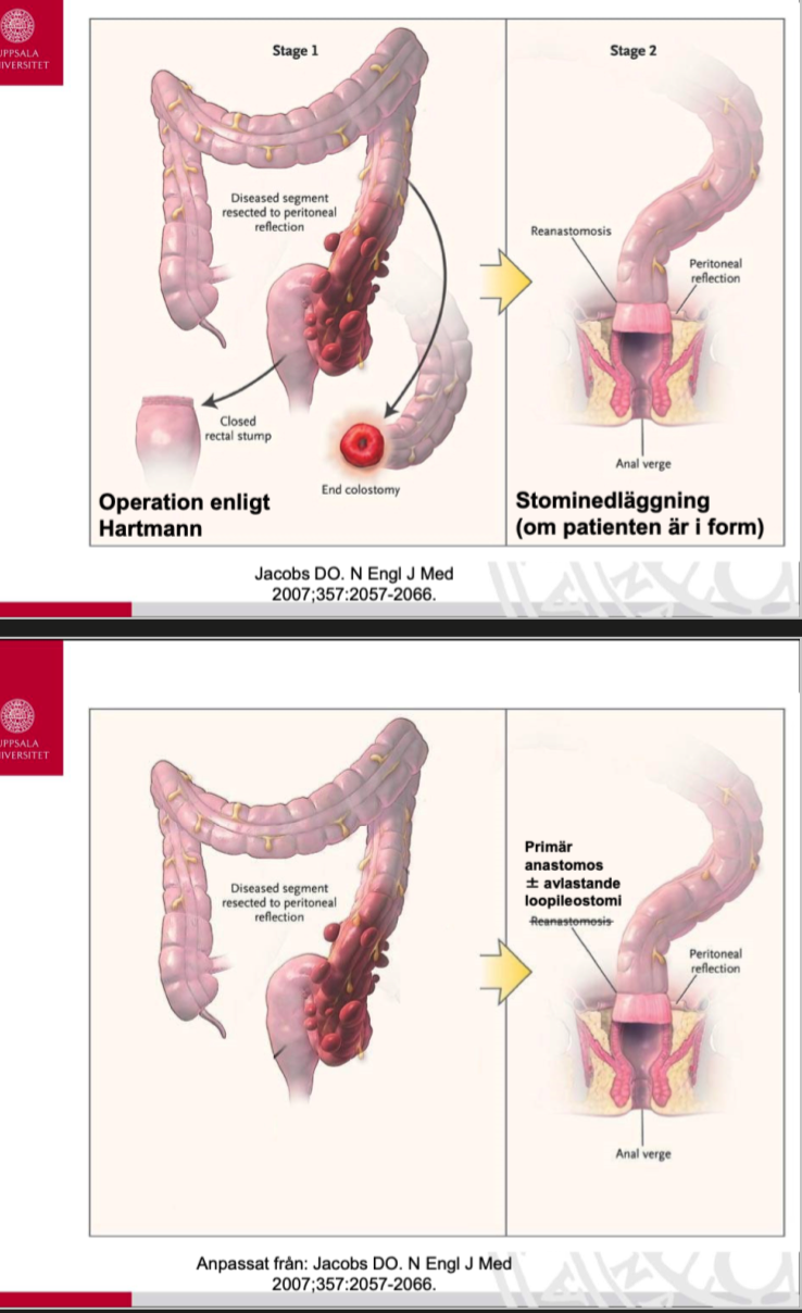 - Ta bort tarmen med divertikulos (ofta sigmoideum) –> sluter rektum –> lägger en kolostomi.