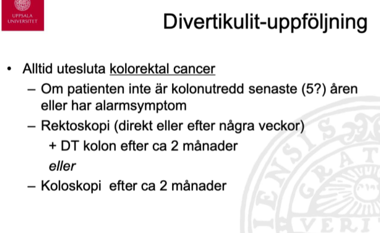 Koloskopi (om inte gjorts inom senaste 5 åren eller har alarmsymtom)
