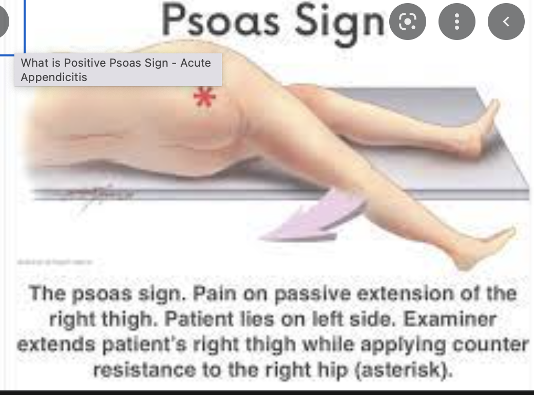 There are a number of clinical signs of an acute appendicitis. One of these is psoas sign. What is this?