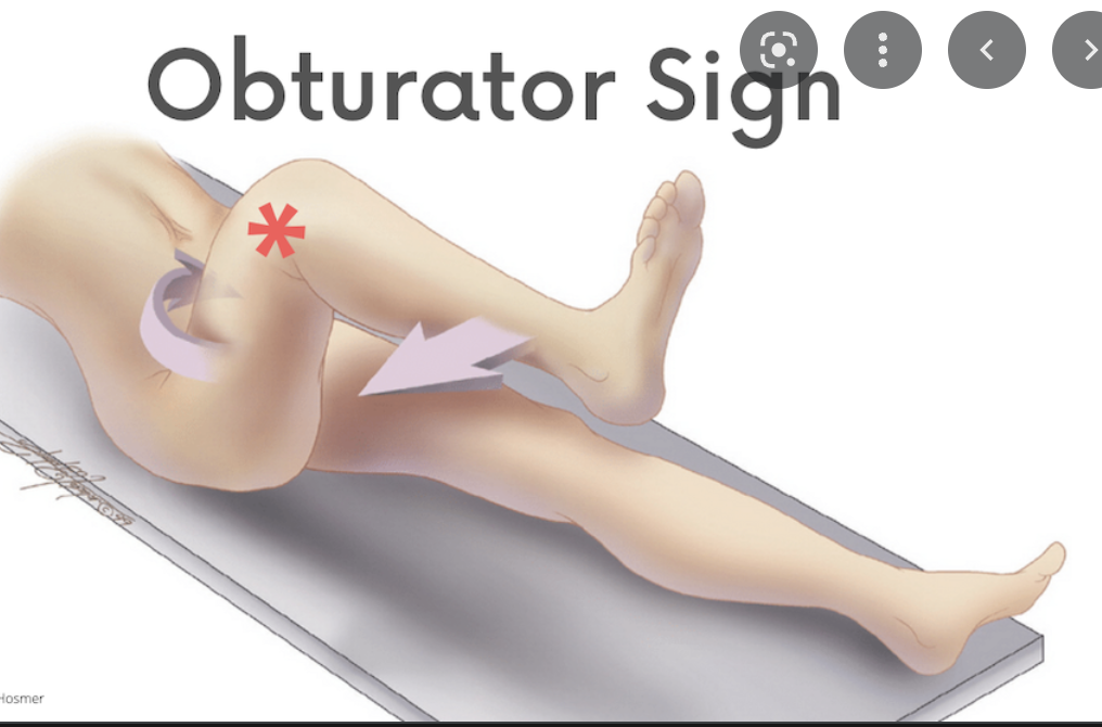 There are a number of clinical signs of an acute appendicitis. One of these is obturator sign. What is this?