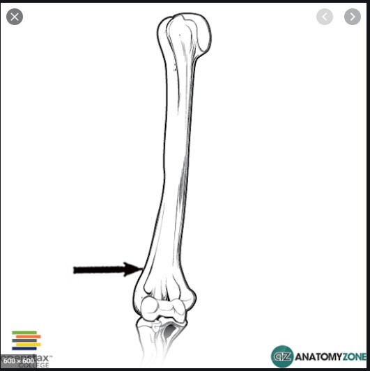 distal end of ulna, the shaft narrows and terminates in a knoblike bone that has a postermoedial styloid process