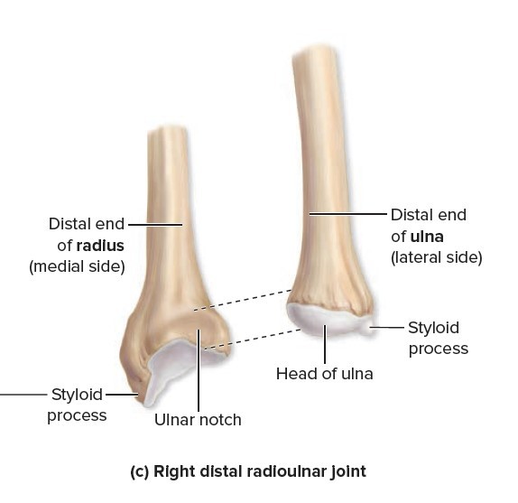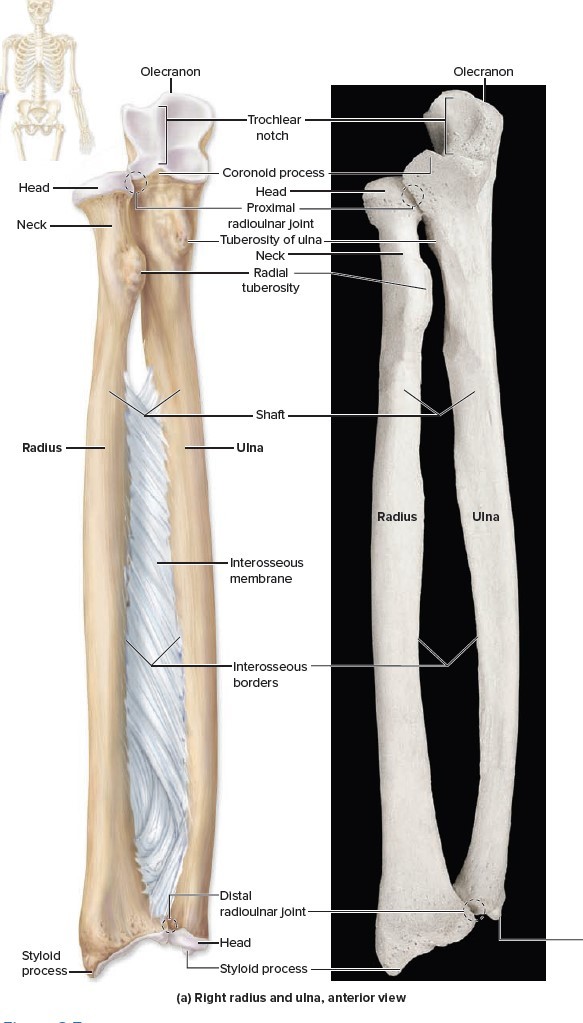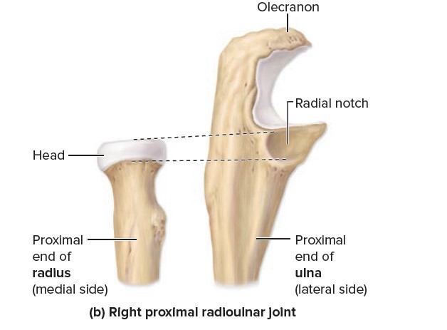 proximal end of radius has a distinctive disc-shaped head that articulates with the capitulum of the humerus.
