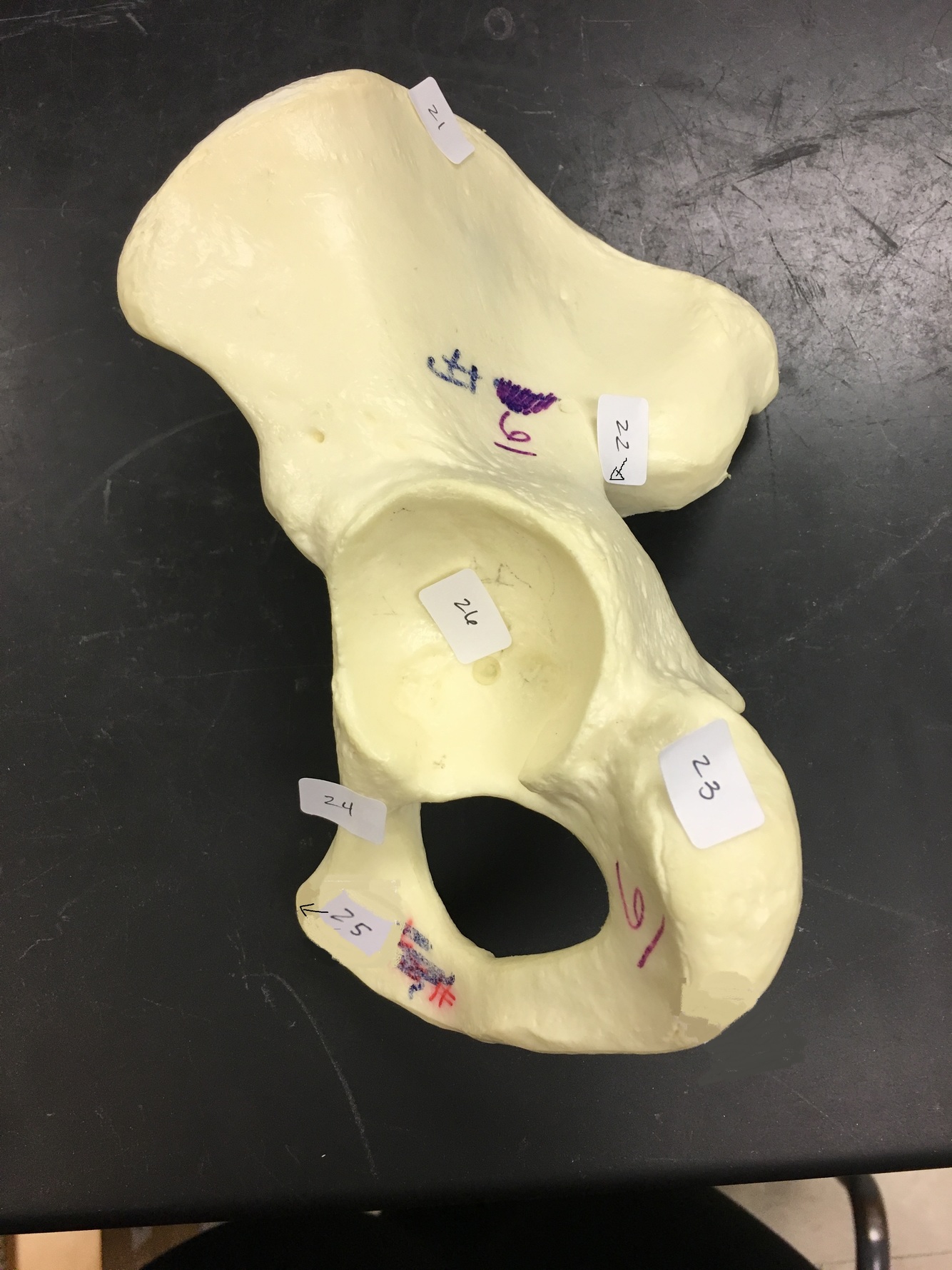 #21- **Ilium** – the most superior region articulates with the sacrum #22- **Sciatic notch** – This is the very large notch in the posterior, inferior pelvic border. The sciatic nerve (the longest nerve in the body) passes through this notch.