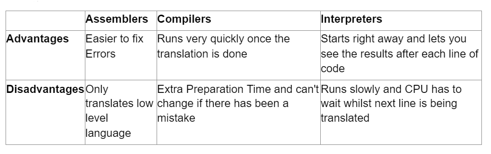 What are the Advantages and Disadvantages of Assemblers, Compilers and Interpreters