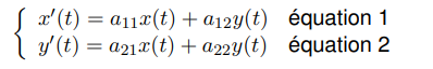 Pour résoudre ce système on élimine une des deux fonctions y(t) par exemple en calculant x’‘(t) en fonction de y’(t). On obtient une équation différentielle d’ordre 2 en x(t) que l’on peut résoudre