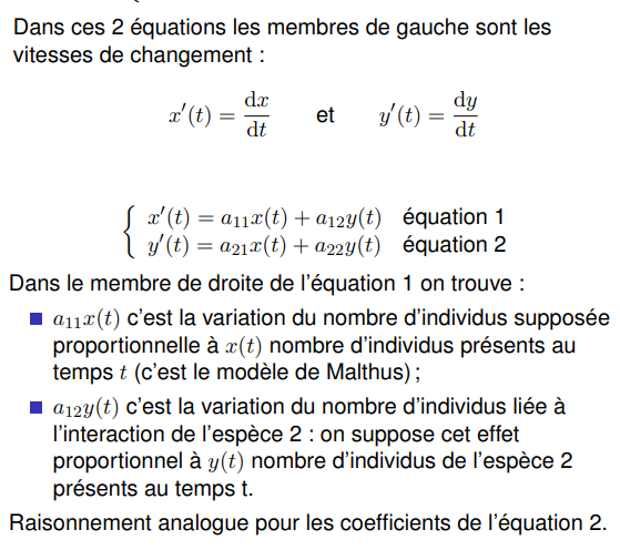 Par deux équations différentielles chacune exprimant la vitesse de changement d’une espèce, on peut ainsi étudier la dynamique de cette population de deux espèces