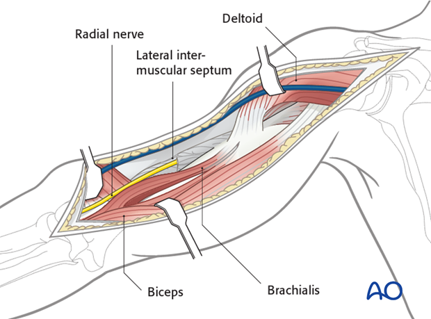 Incision from coracoid → deltopectoral groove → up to the insertion of deltoid on deltoid tuberosity → lateral aspect of biceps → stop 5cm before flexion crease