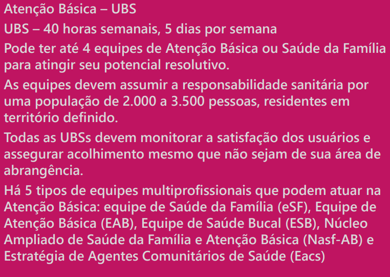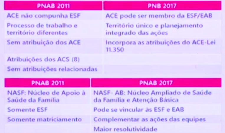 PNAB 2017: ESF deixou de ser o único modelo para a organização da Atenção Básica no Brasil. Equipes multiprofissionais com médicos, enfermeiros e técnicos ou auxiliares de enfermagem – EAB. Não há obrigatoriedade de ter ACS. Carga horária mínima de 10 horas semanais para os médicos. Flexibilização do atendimento nas UBSs, não sendo obrigatório o usuário pertencer ao território de abrangência de sua equipe de referência para ser atendido.