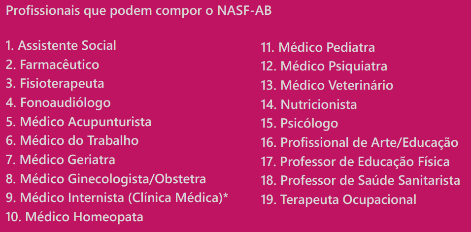 Núcleo Ampliado de Saúde da Família e Atenção Básica (Nasf-AB) ੦ suporte (clínico, pedagógico e sanitário) às eSFs e eABs ੦ equipes do Nasf-AB não são independentes nem de livre acesso para atendimento individual ou coletivo