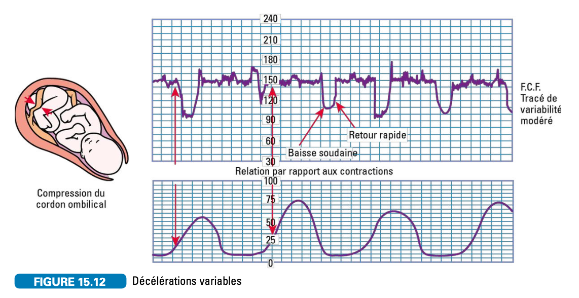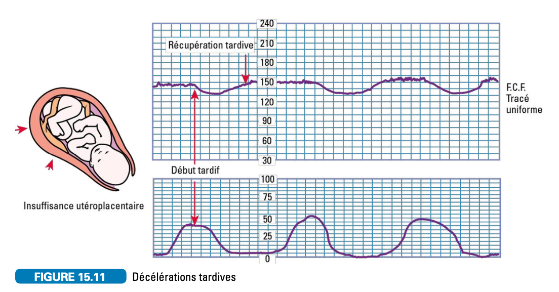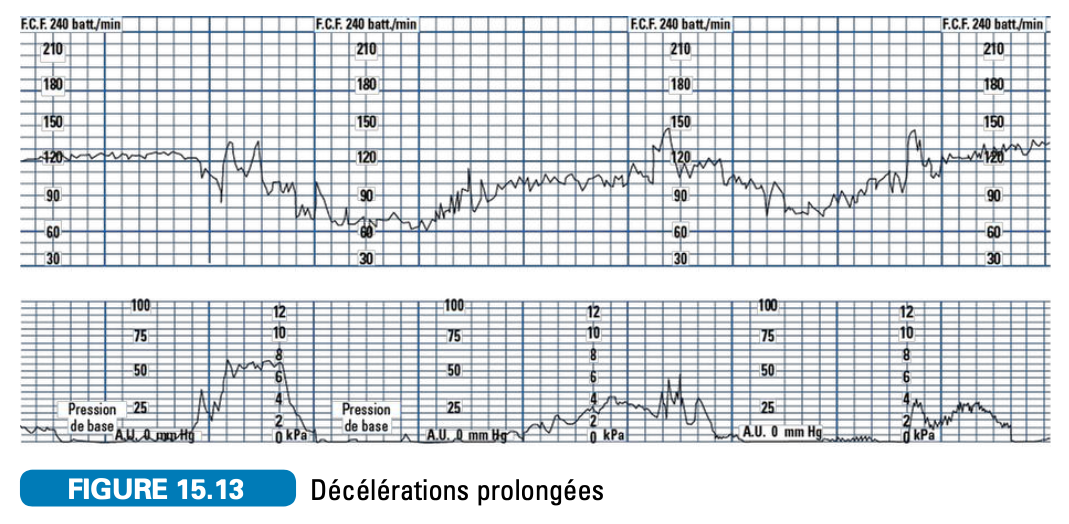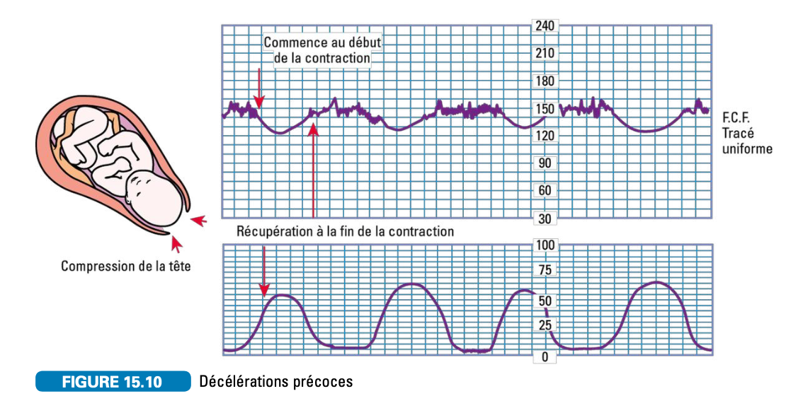 précoce, tardive, variable et prolongée. Les décélérations de la F.C.F. sont définies en fonction de leur forme ainsi que de leur relation avec la contraction