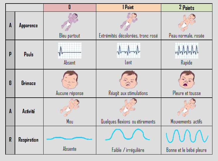 ombilical, respiration par observation, tonus musculaire, réactivité à l’environnement