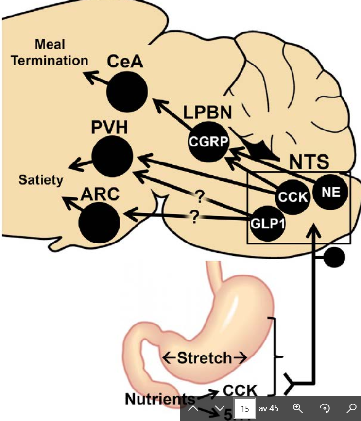 Enteroendokrina celler -> peptider -> vagusterminaler (och till hjärna genom cirkulation)