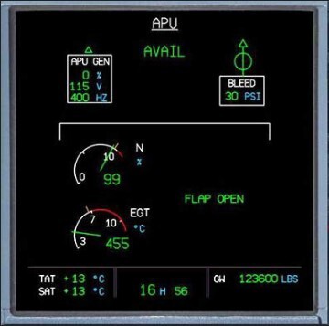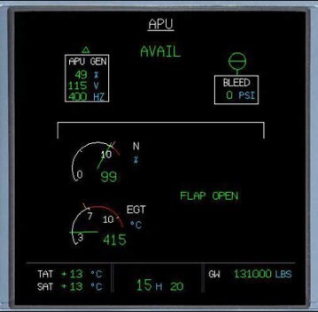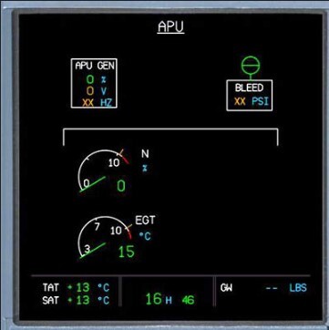 The APU Systems Display shows that the APU is providing bleed air.