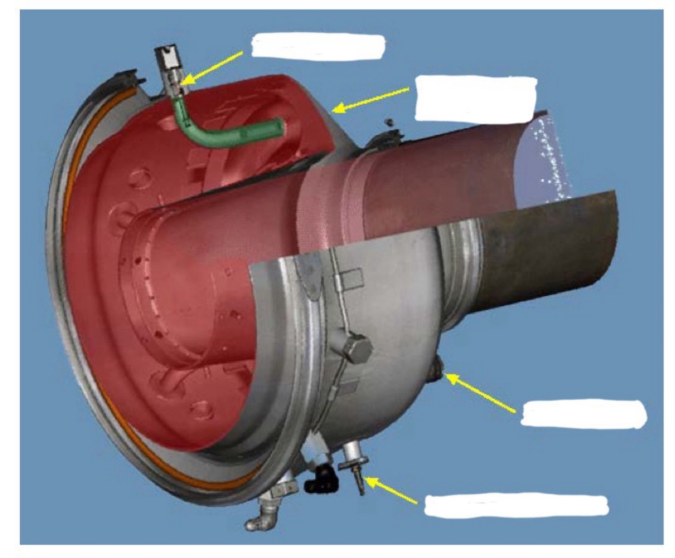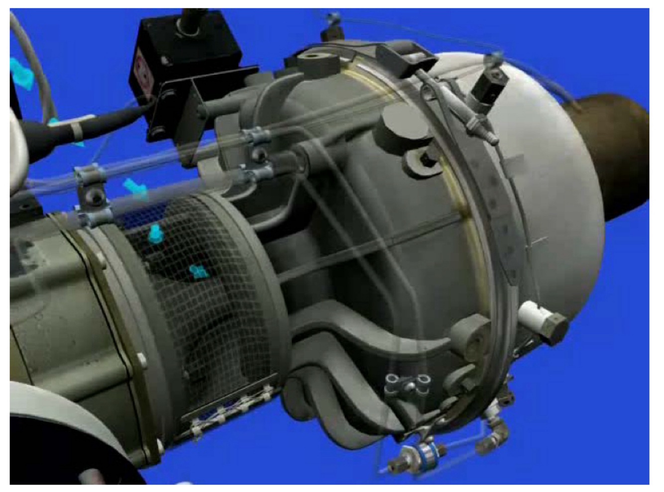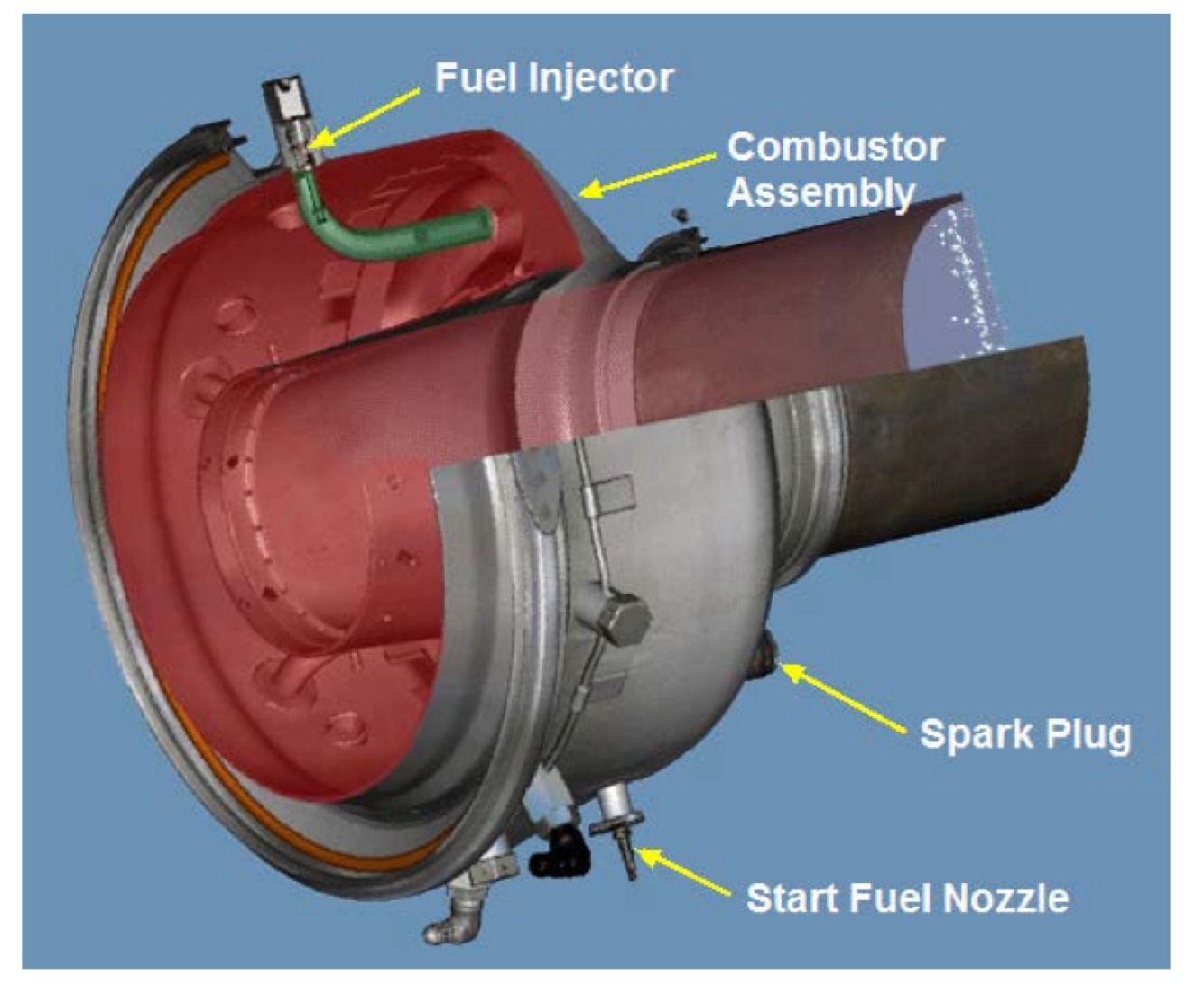 (4) The combustor housing has threaded bosses for installation of a spark plug, start fuel nozzle, and fuel manifold.