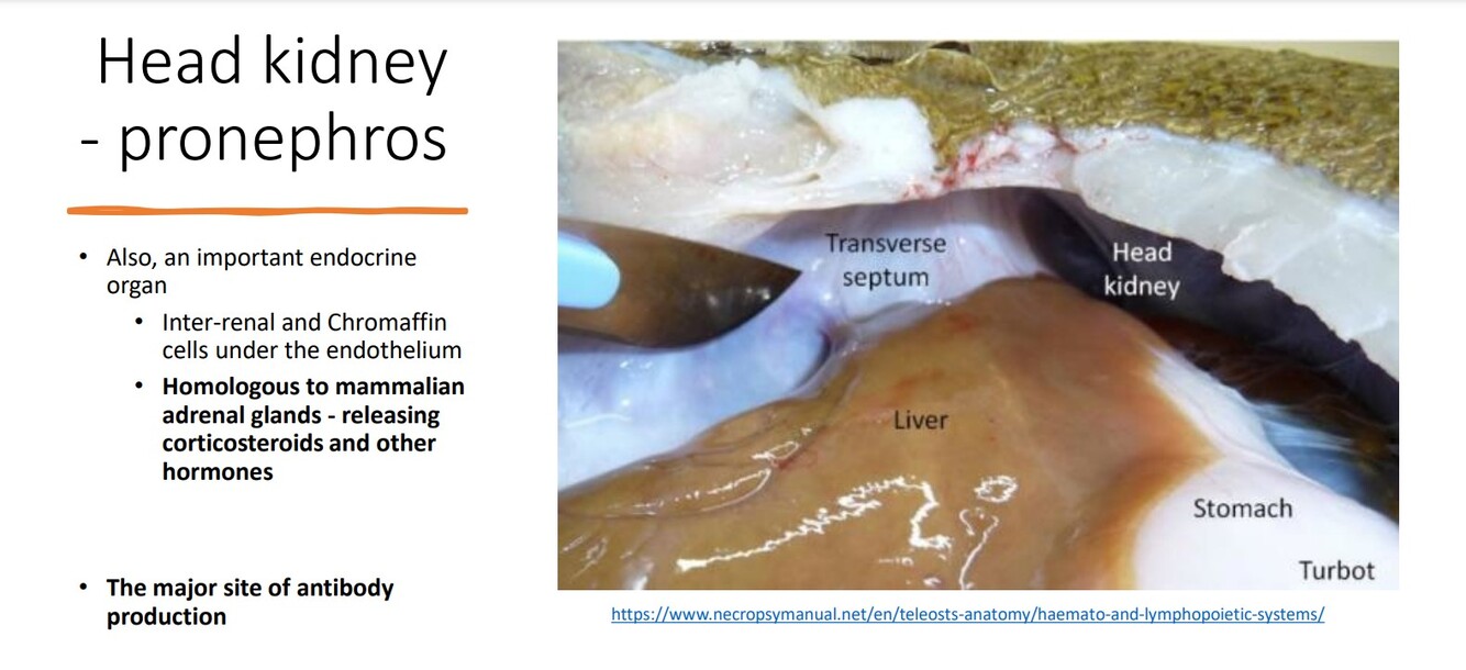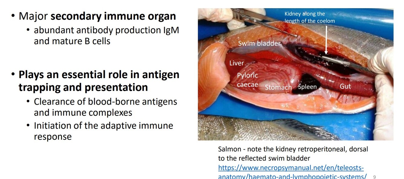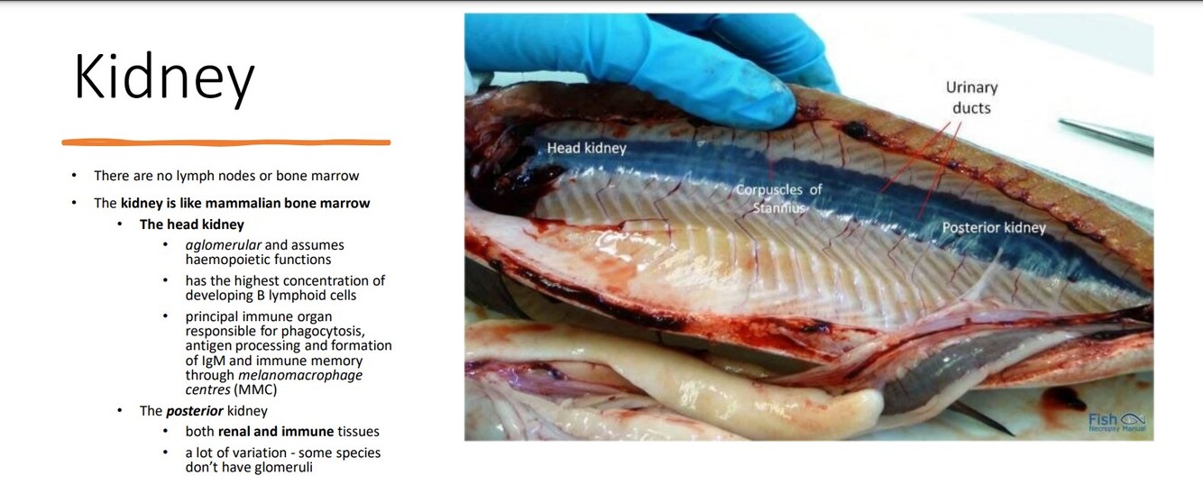- principle immune organ responsible for processing and formation of IgM and immune memory through melanomacrophage centres (MMC)/