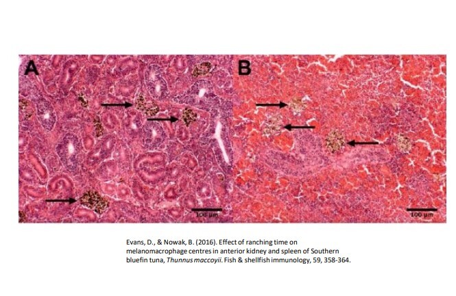 Chronic inflammation in fish often presents as hyperpigmented ‘dark’ fish = poor doing