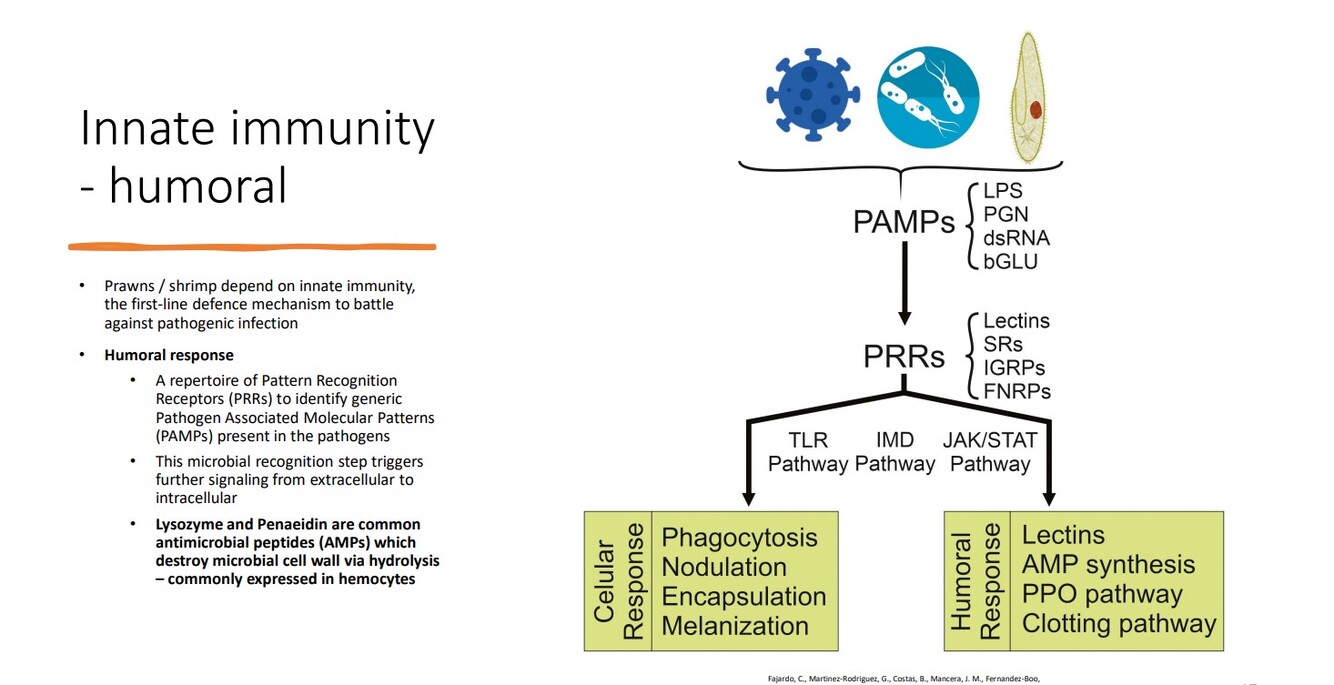cuticle/surface, semi closed circulatory system, copper based hemocyanin, hemocytes and (lysozyme and Penaeidin).