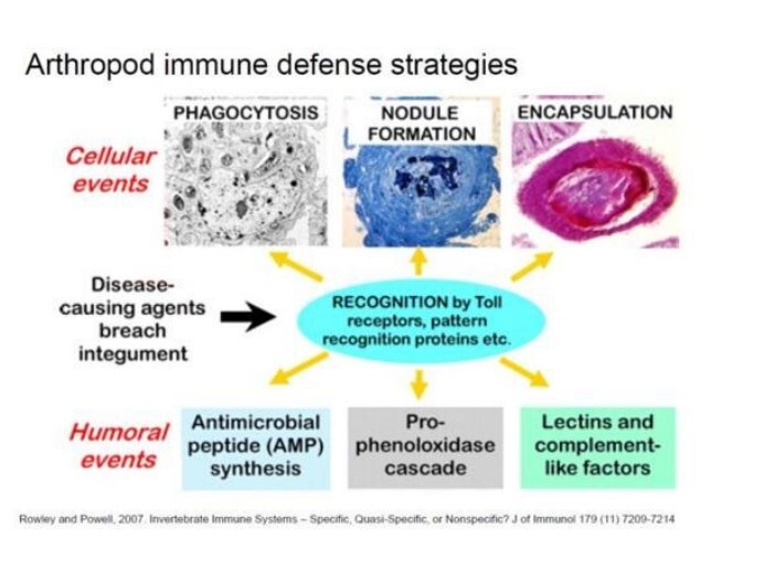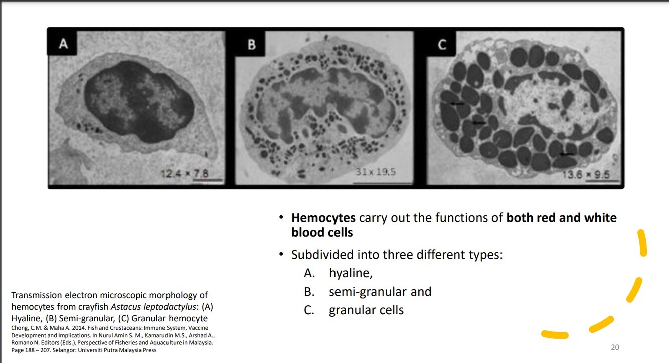 - several hyaline hemocytes react cooperatively against many small microbes.