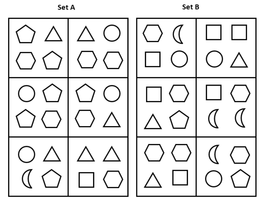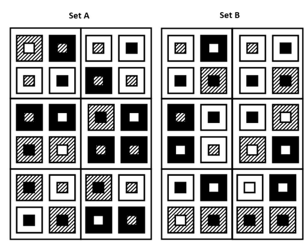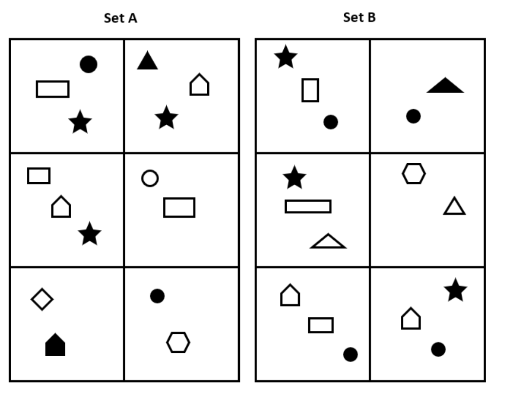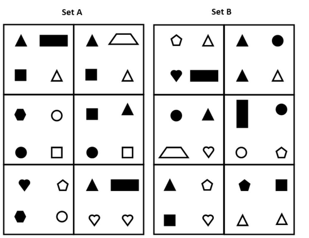 B: There is a 2x3 v shapes pattern of the same black shapes, i.e., 3 black squares, octagons, triangles etc..
