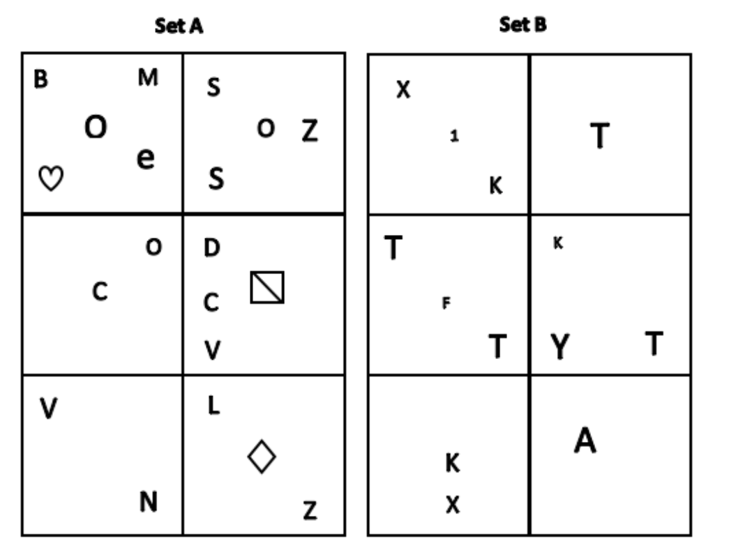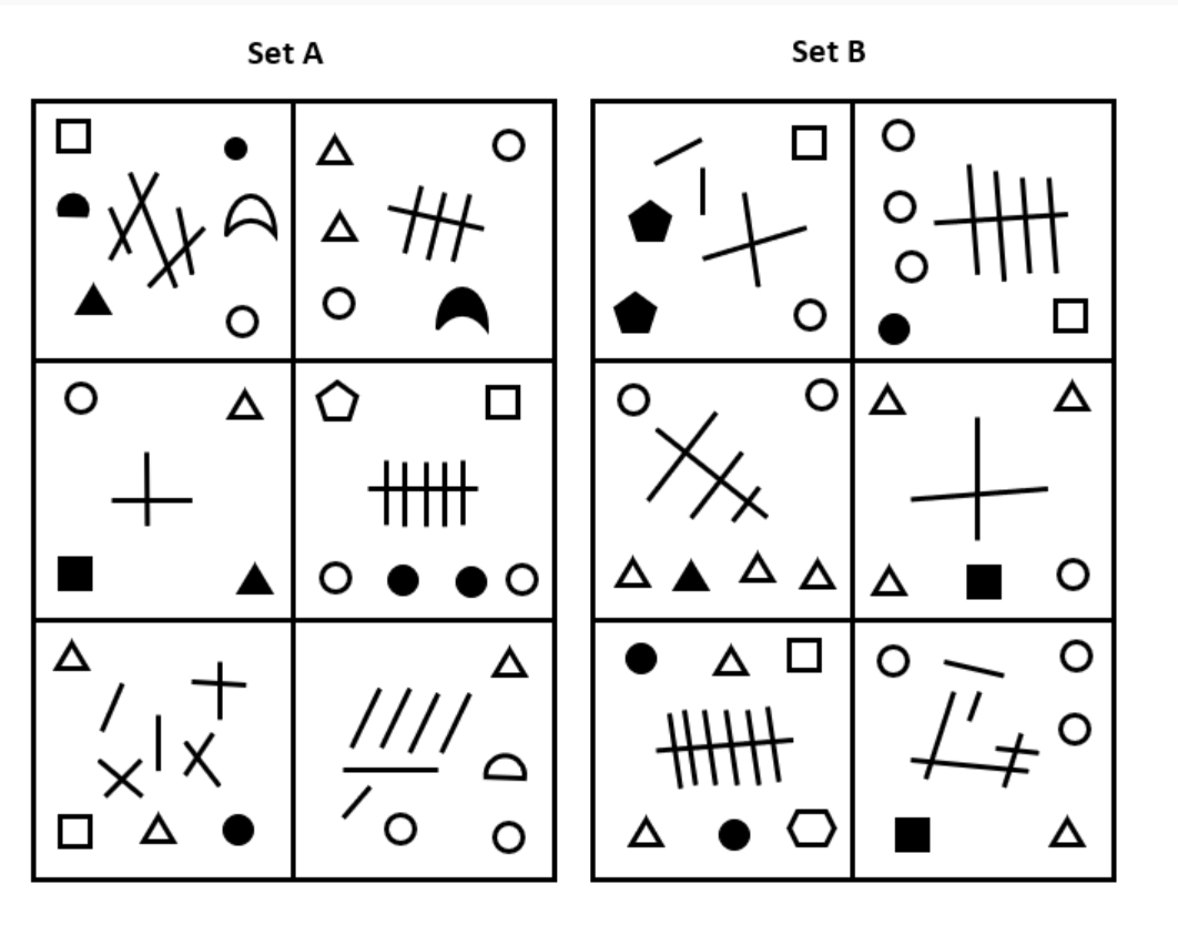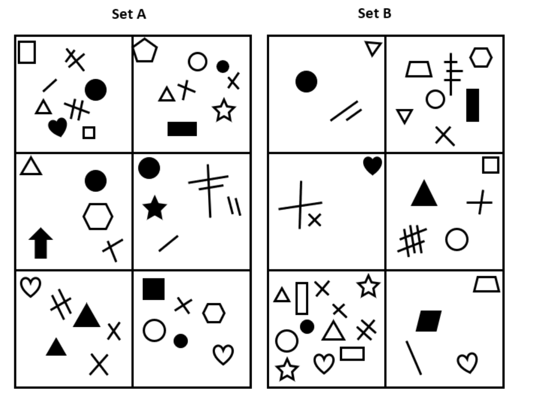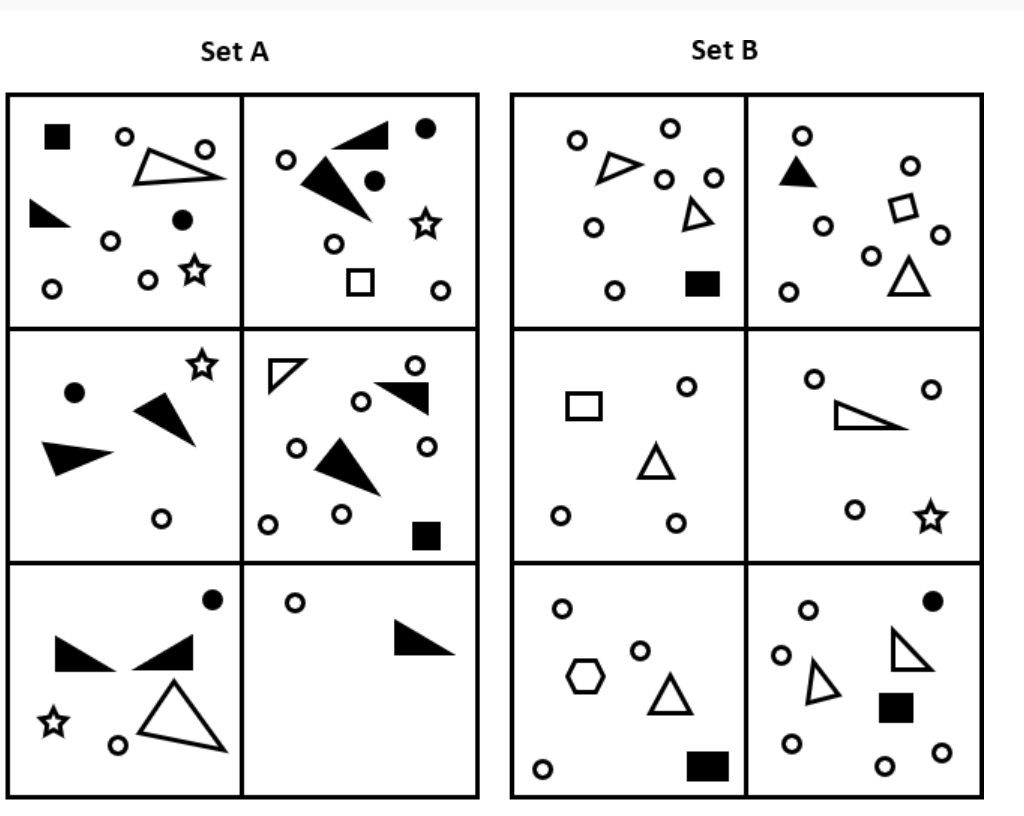 B: There is a 2x3 v shapes pattern of the same black shapes, i.e., 3 black squares, octagons, triangles etc..