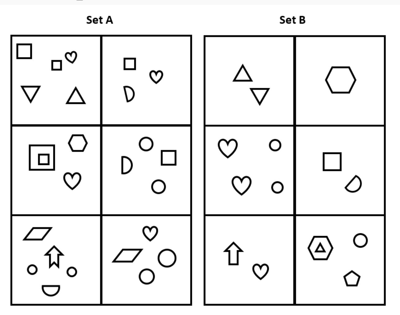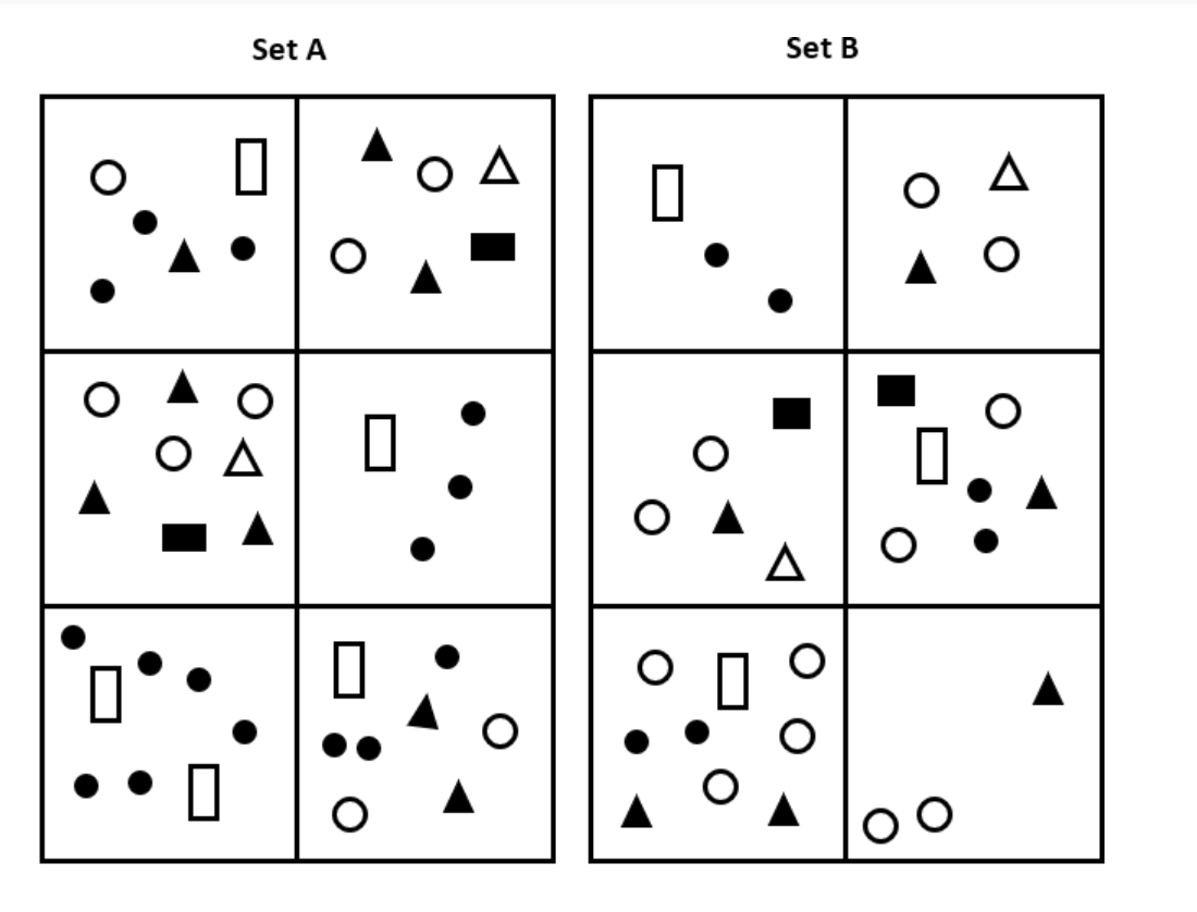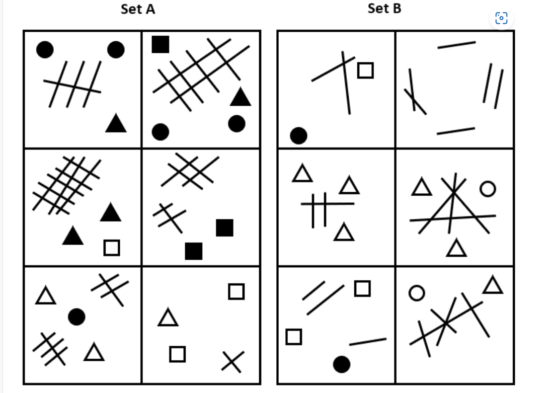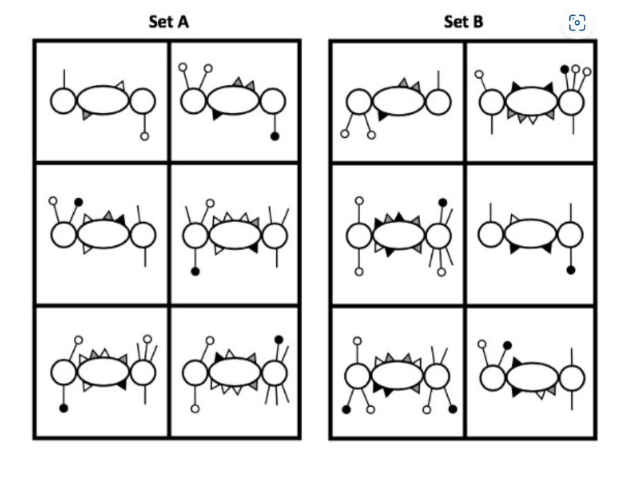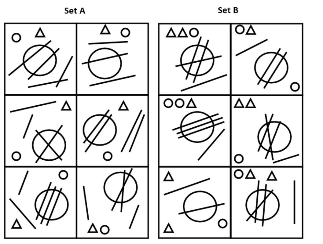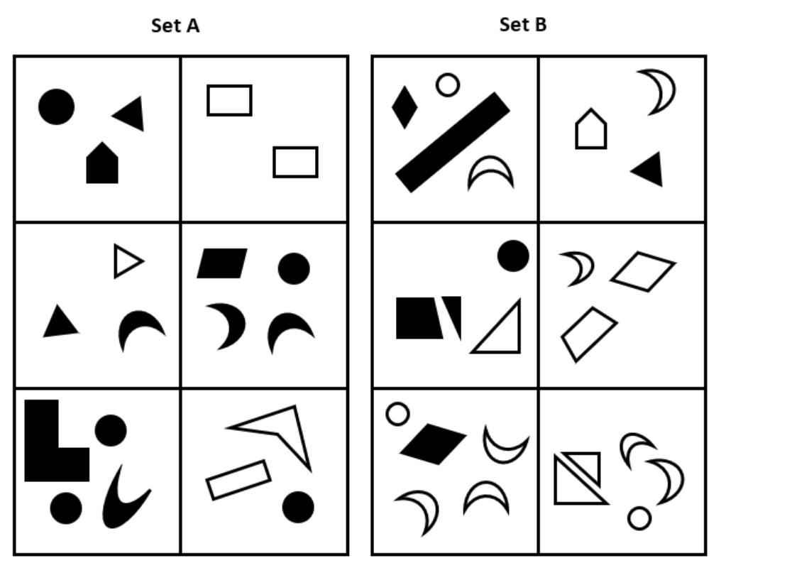 A line with a white circle at the end quals a grey triangle, the same as in set A. In line with a black circle at the end equals a white triangle.