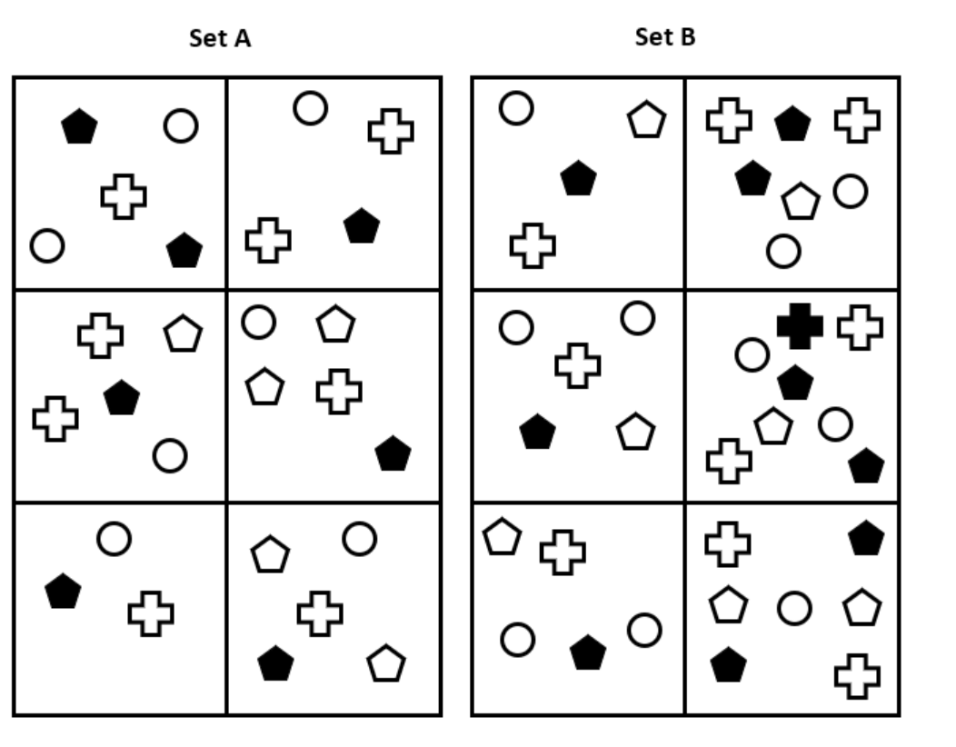 B: The number of unshaded plus sign shapes is equal to shaded pentagons. unshaded circles and unshaded pentagon shapes are distractors.