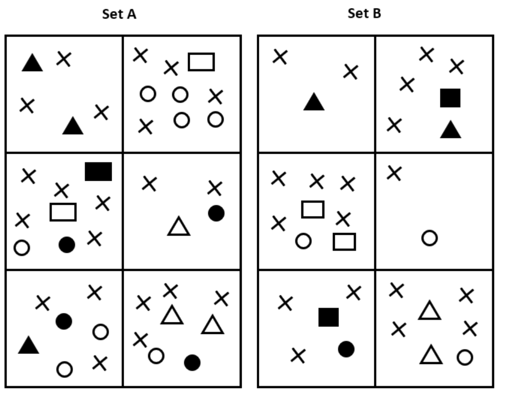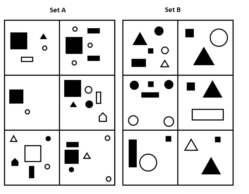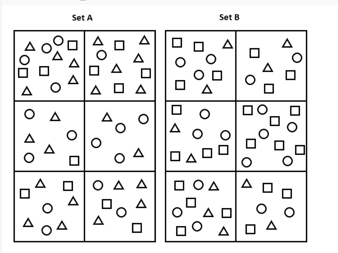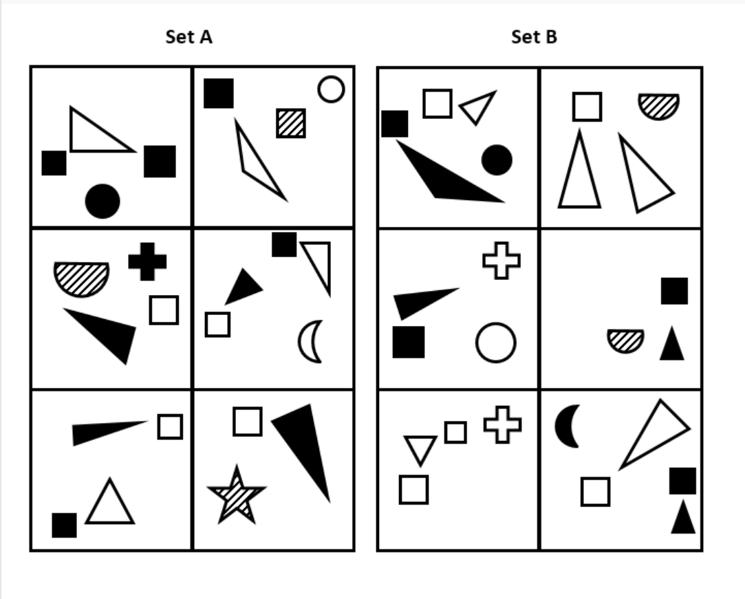 B: Squares are always smaller than other shapes. the shaded to unshaded shapes ratio is 2:1