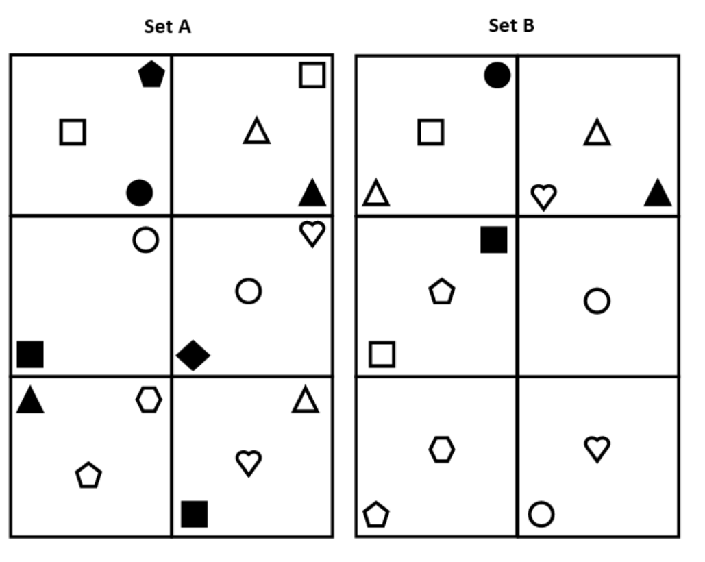 A: The total number of other shapes is the same number of sides present on the shape in the top left corner. There are exactly two shaded shapes.