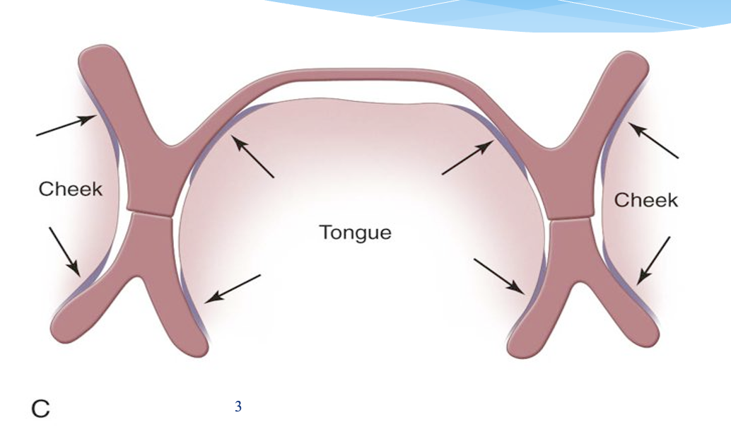 The potential space between the lips and cheeks on one side and the tongue on the other; that area or position where the forces between the tongue and cheeks or lips are equal.