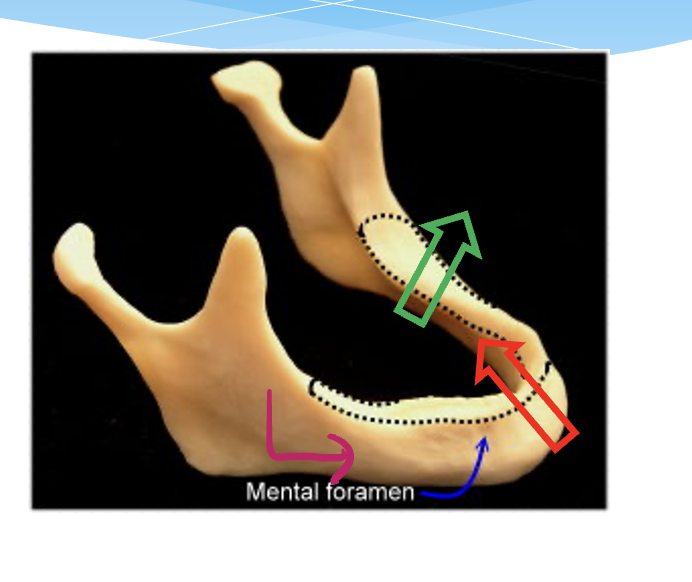 In what directon does the mandibular bone resorb?