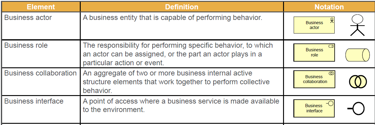 Define active elements of the business layer, which ones are internal and which one external?. What are the notations they use?