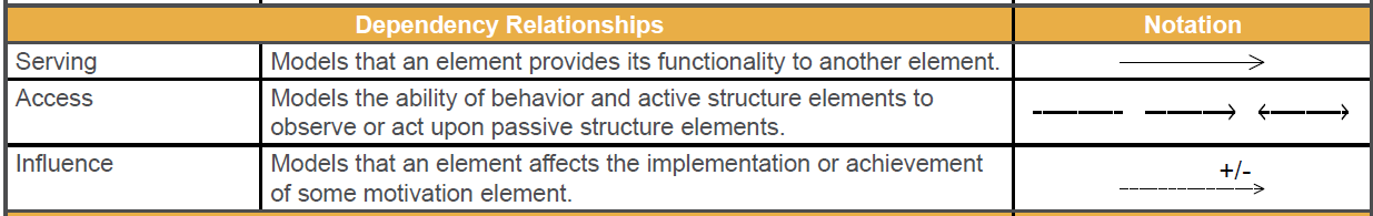 Dependency, which model how elements are used to support other elements